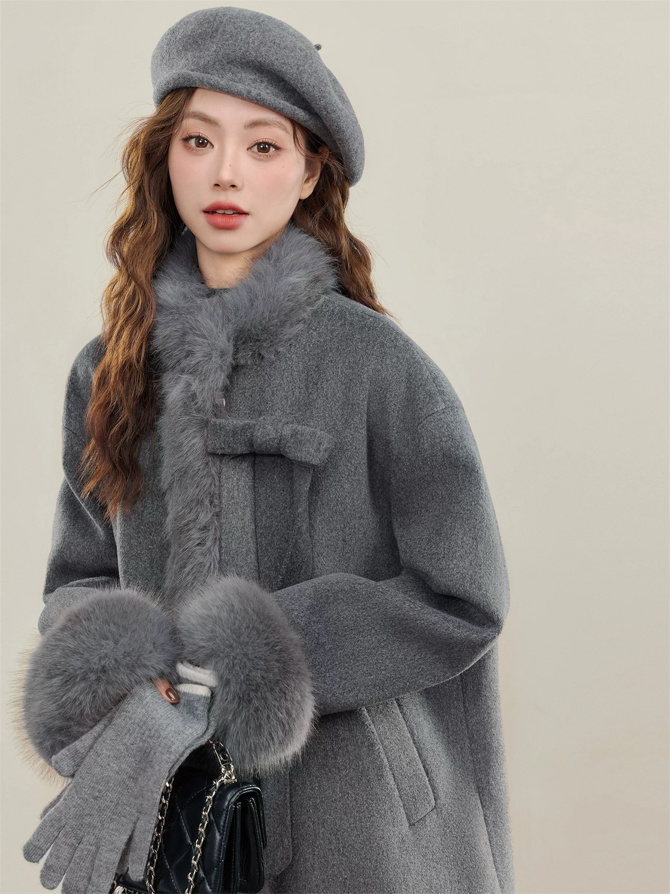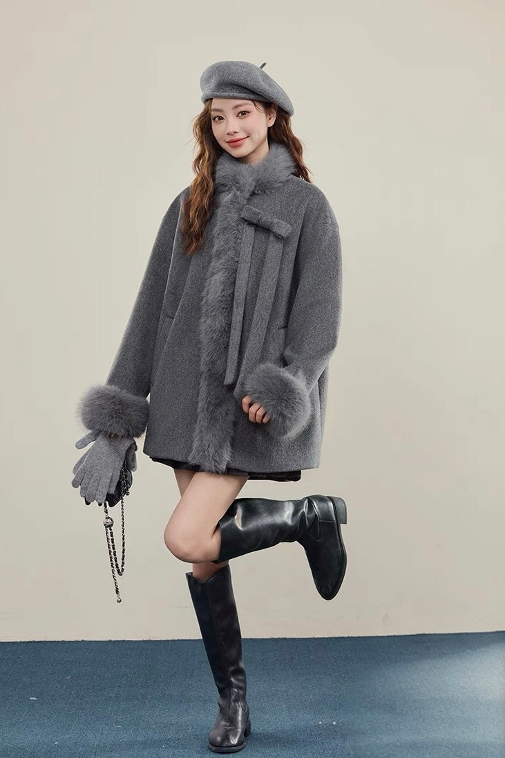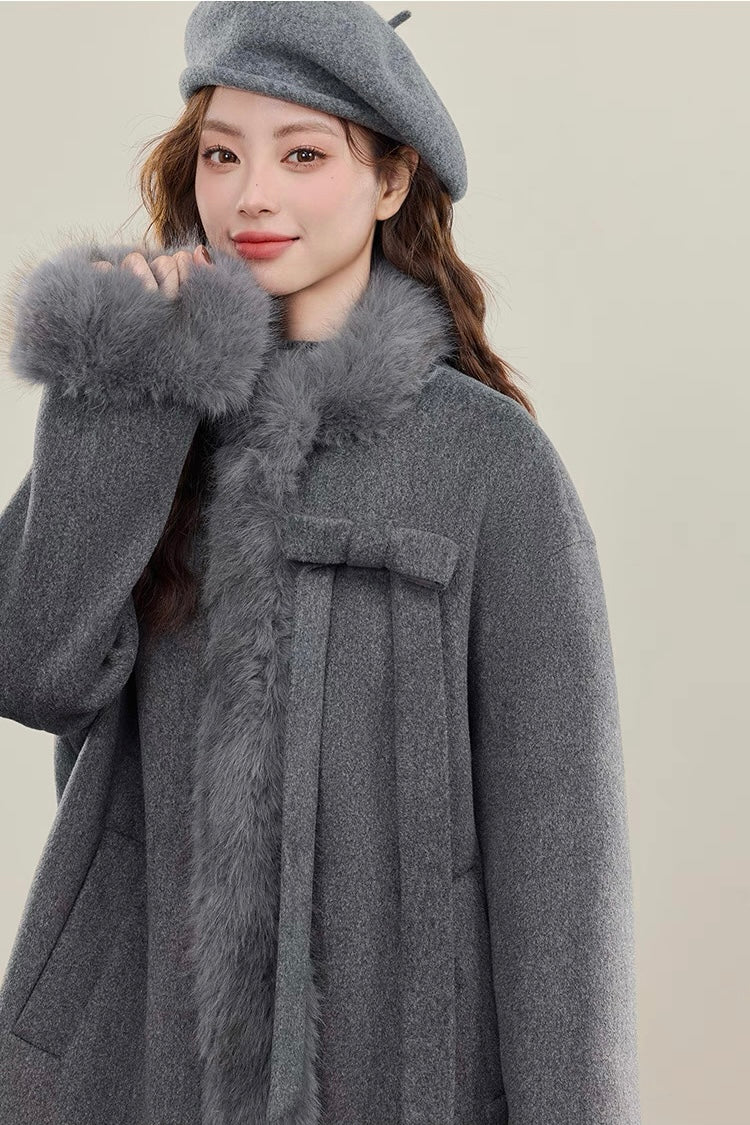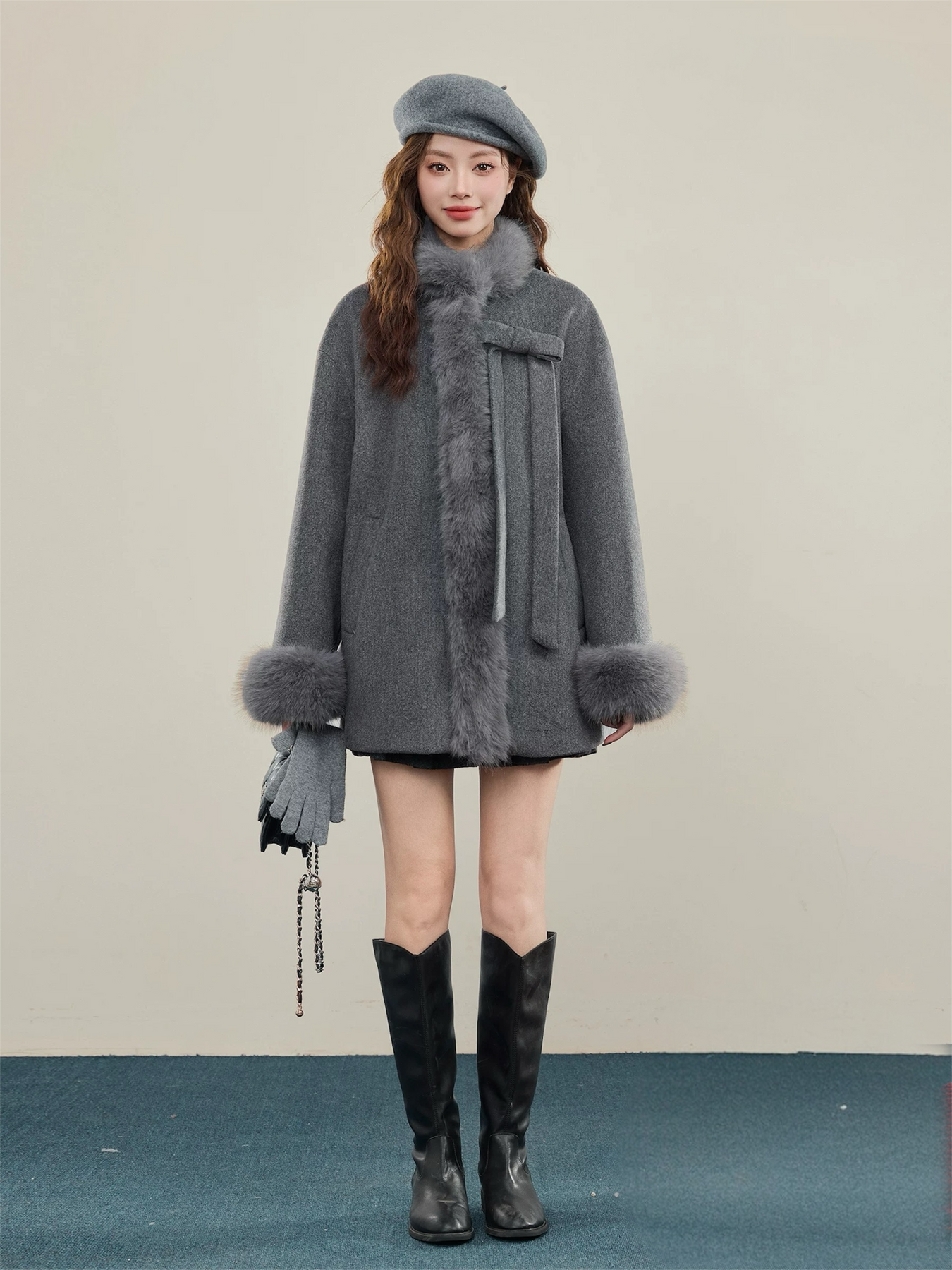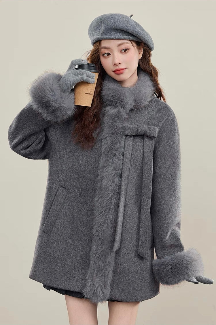 襟元からフロントにかけてのファーラインが顔まわりを華やかに見せ、