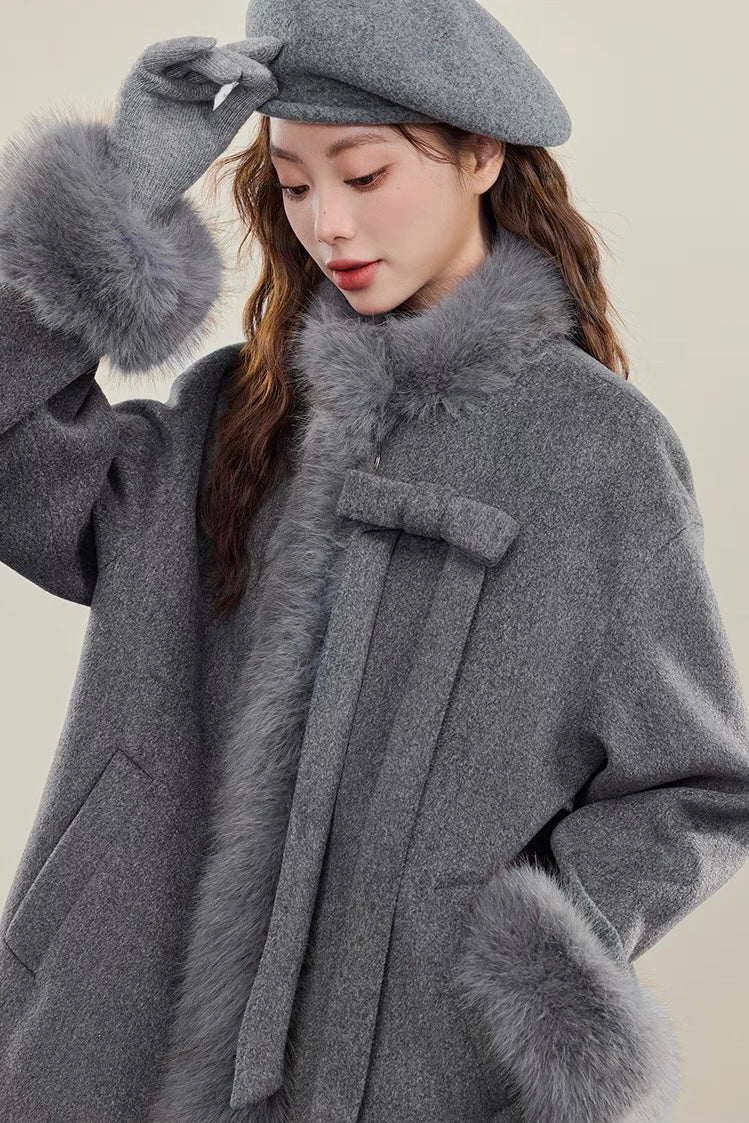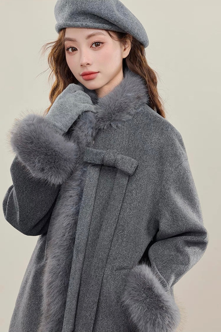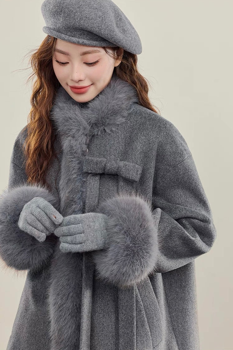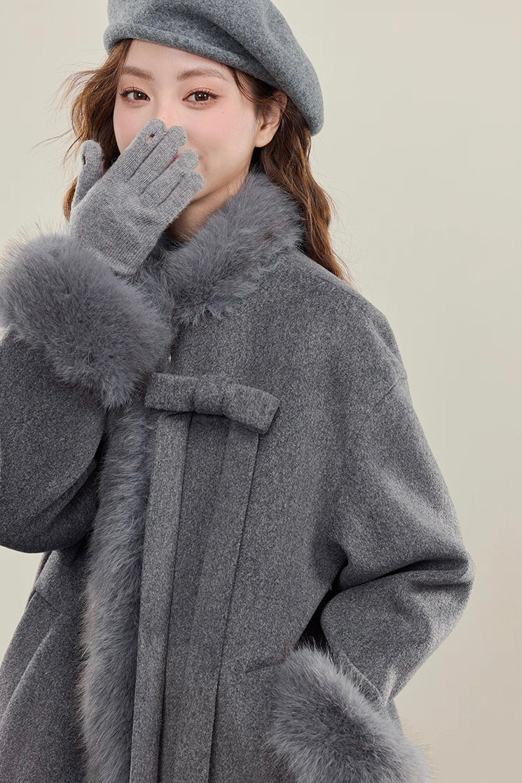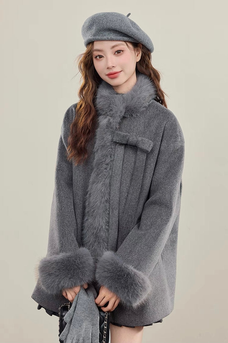 襟元からフロントにかけてのファーラインが顔まわりを華やかに見せ、