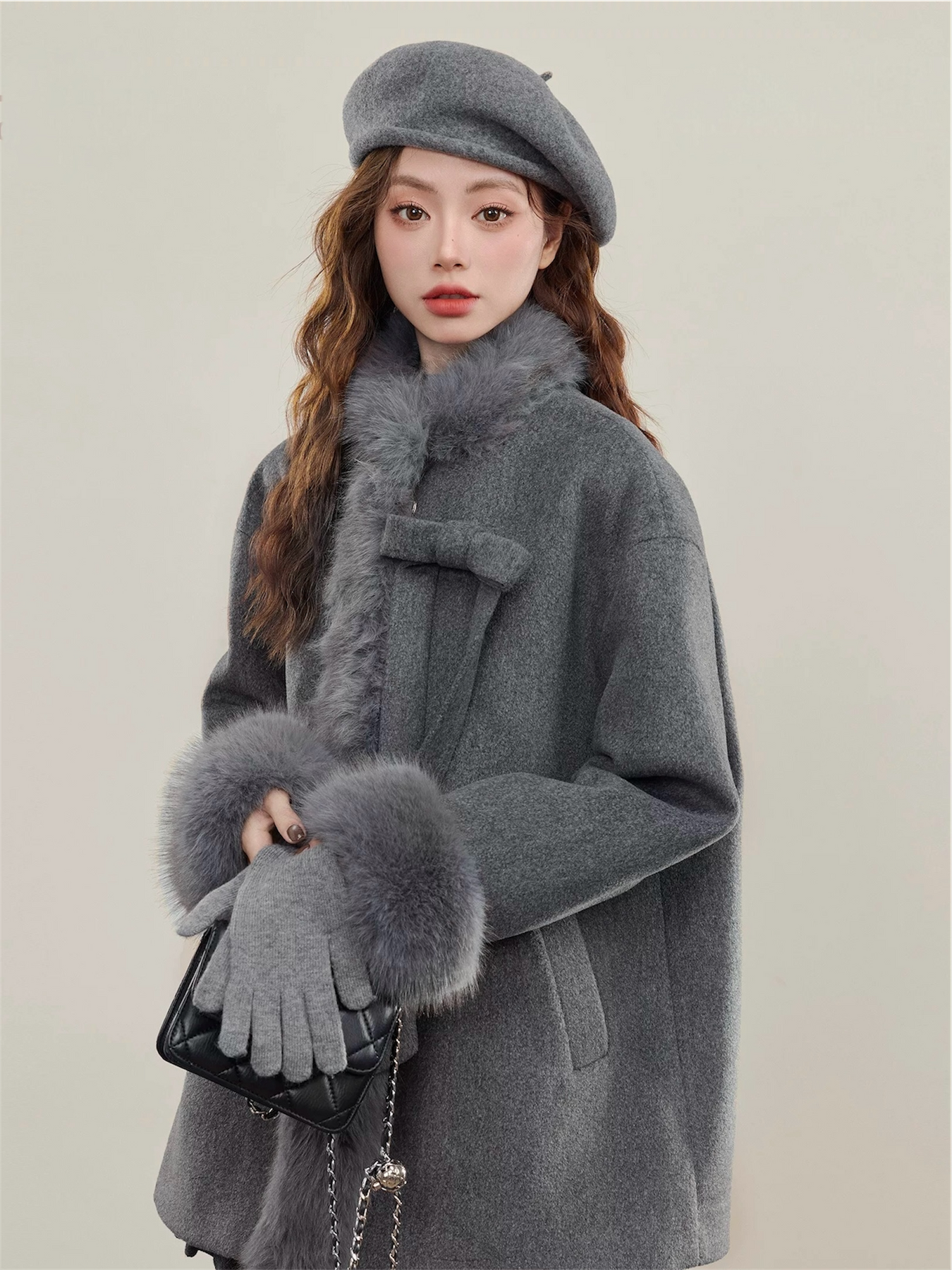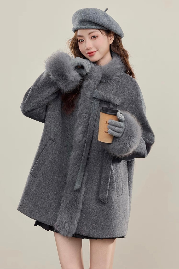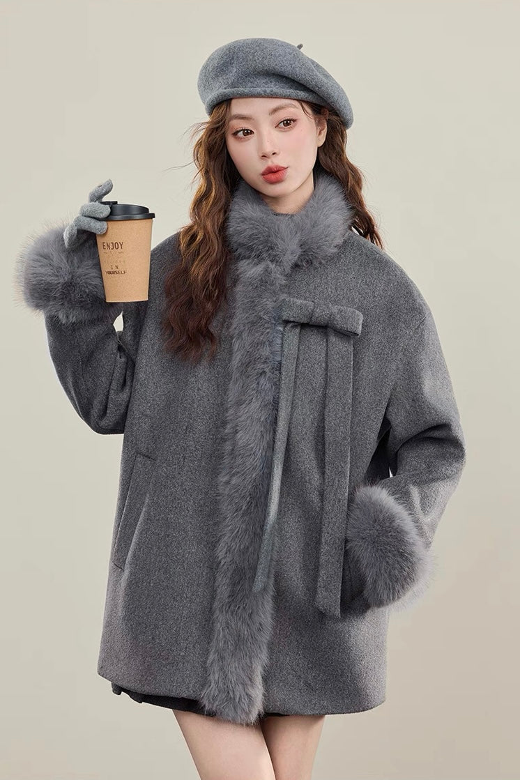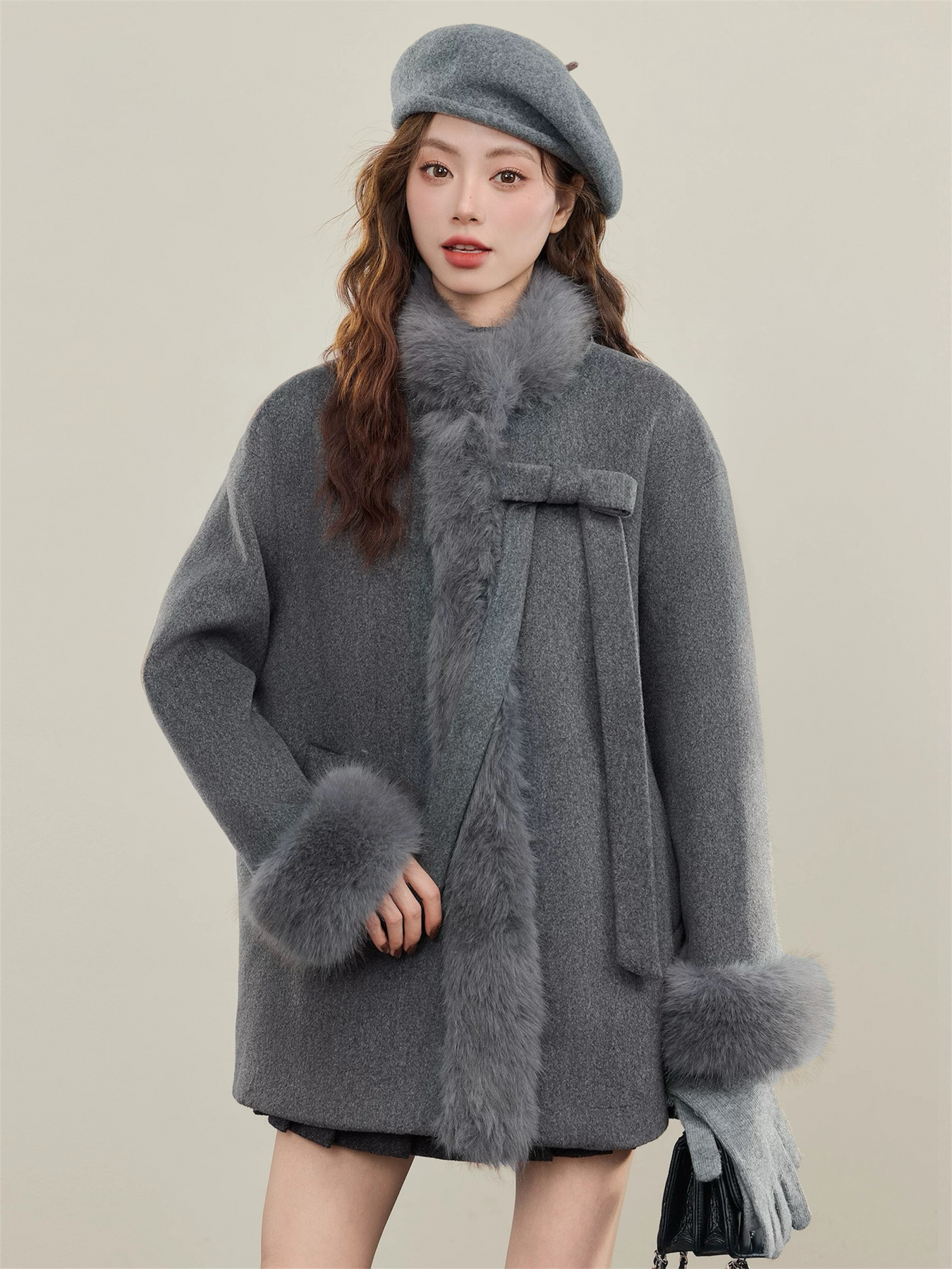 襟元からフロントにかけてのファーラインが顔まわりを華やかに見せ、