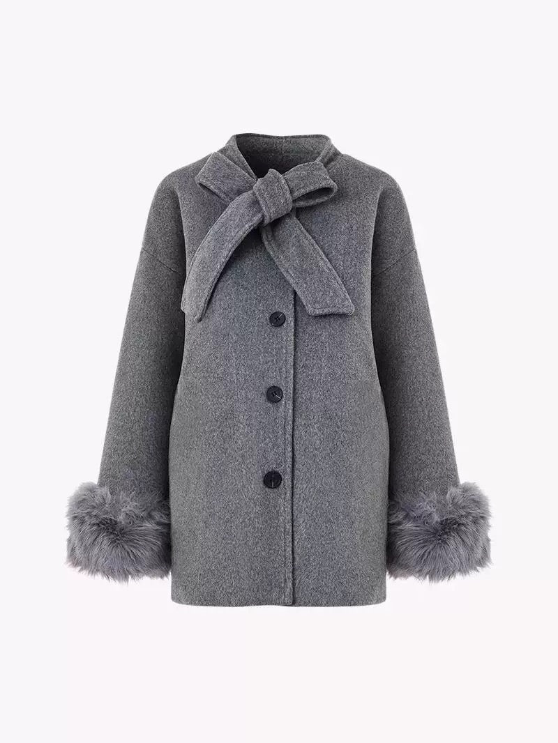 ふわふわのフェイクファーを贅沢にあしらったリボンファーコート。