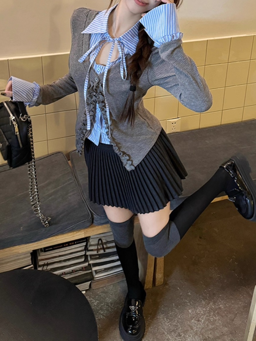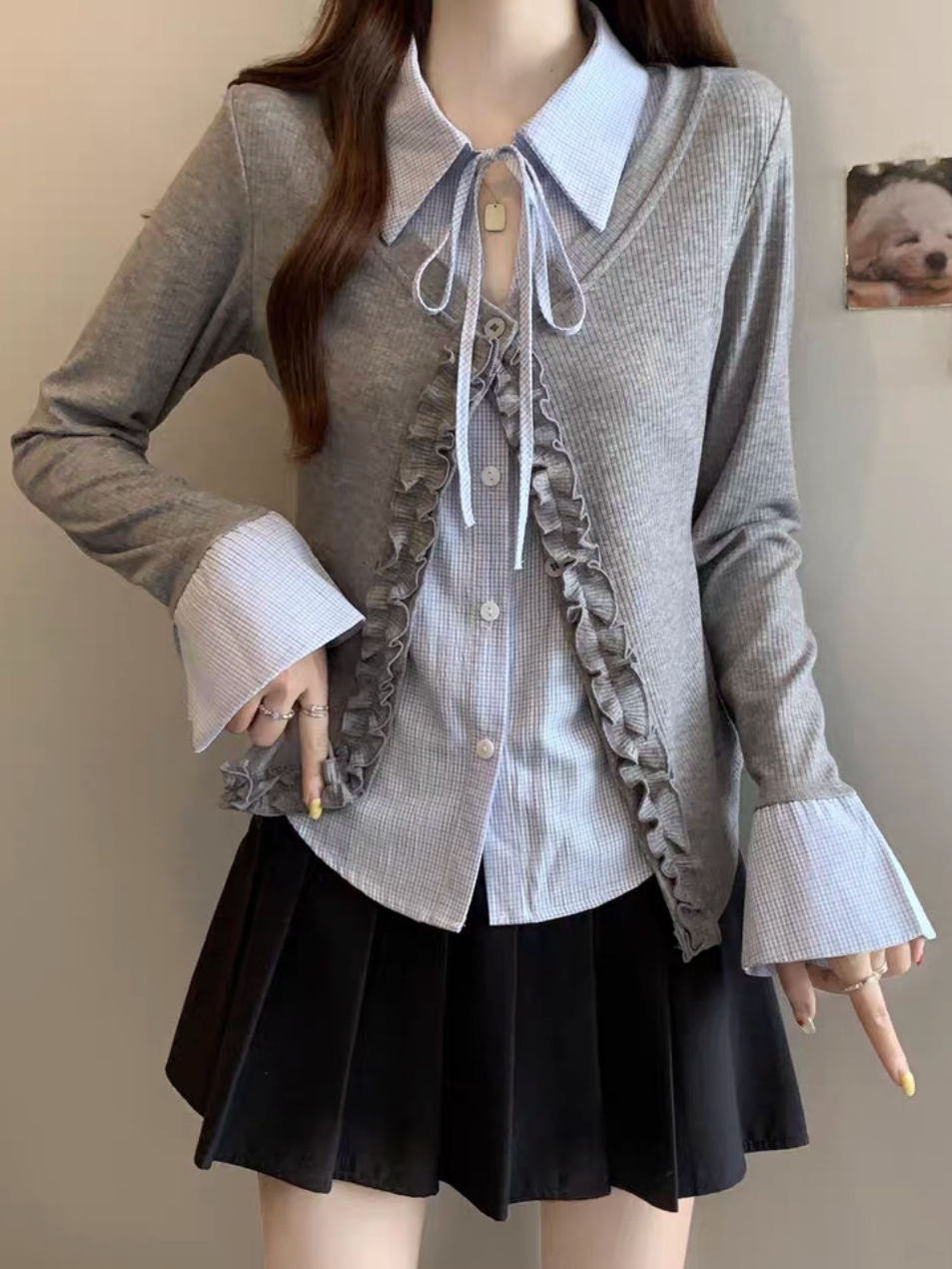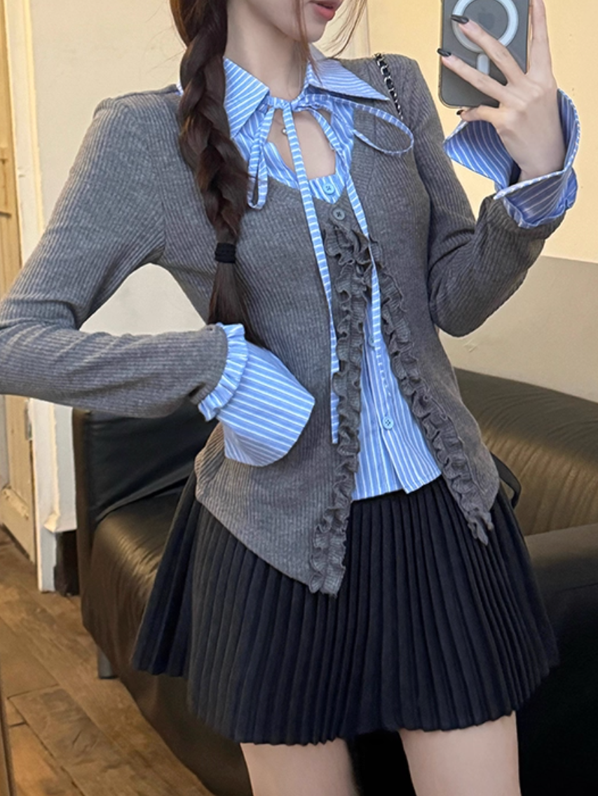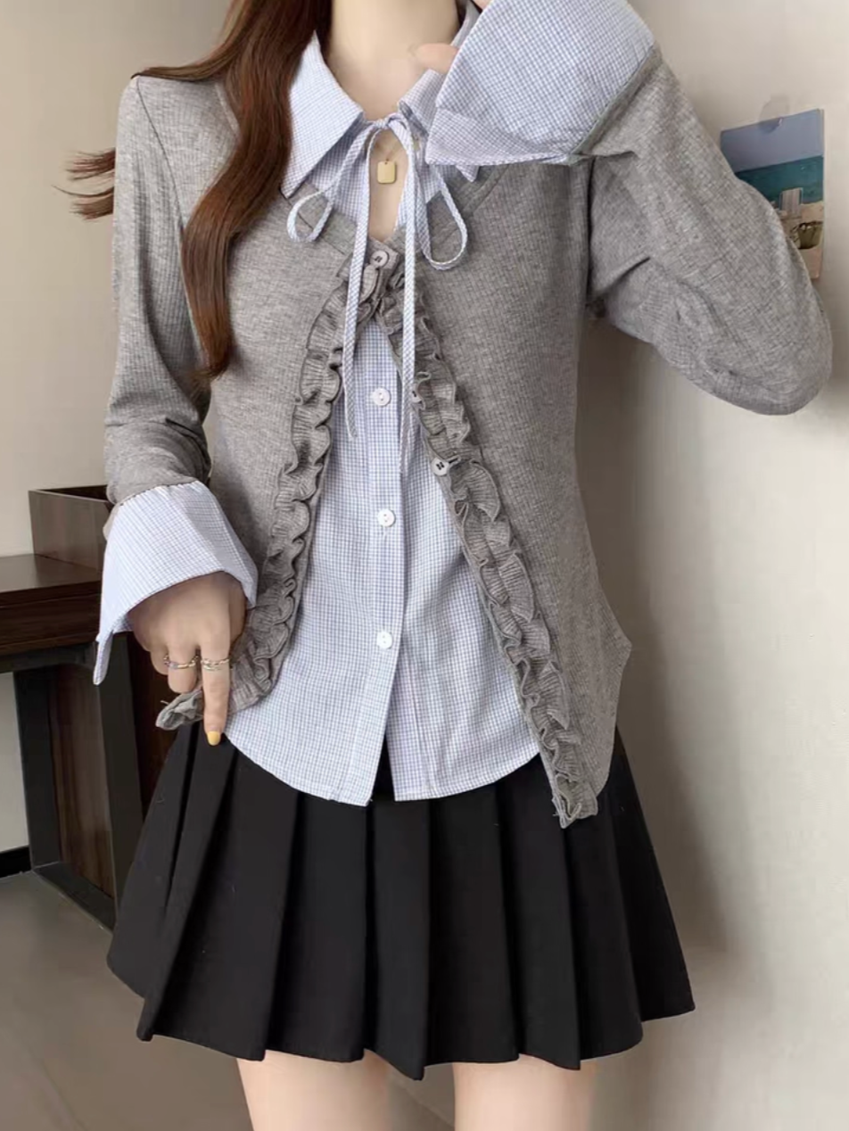 シャツレイヤード風フリルステッチレースアップトップス Mc 392