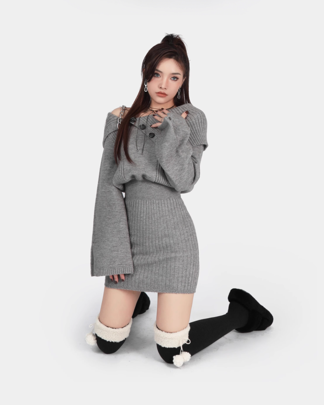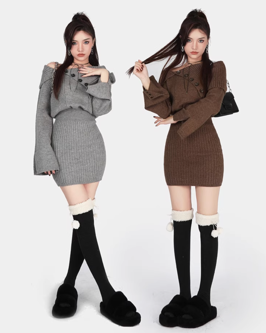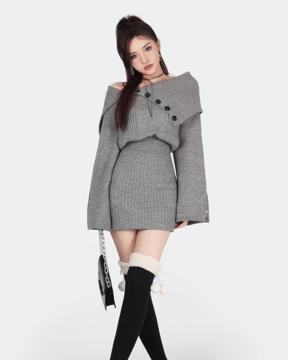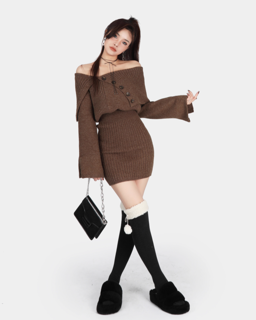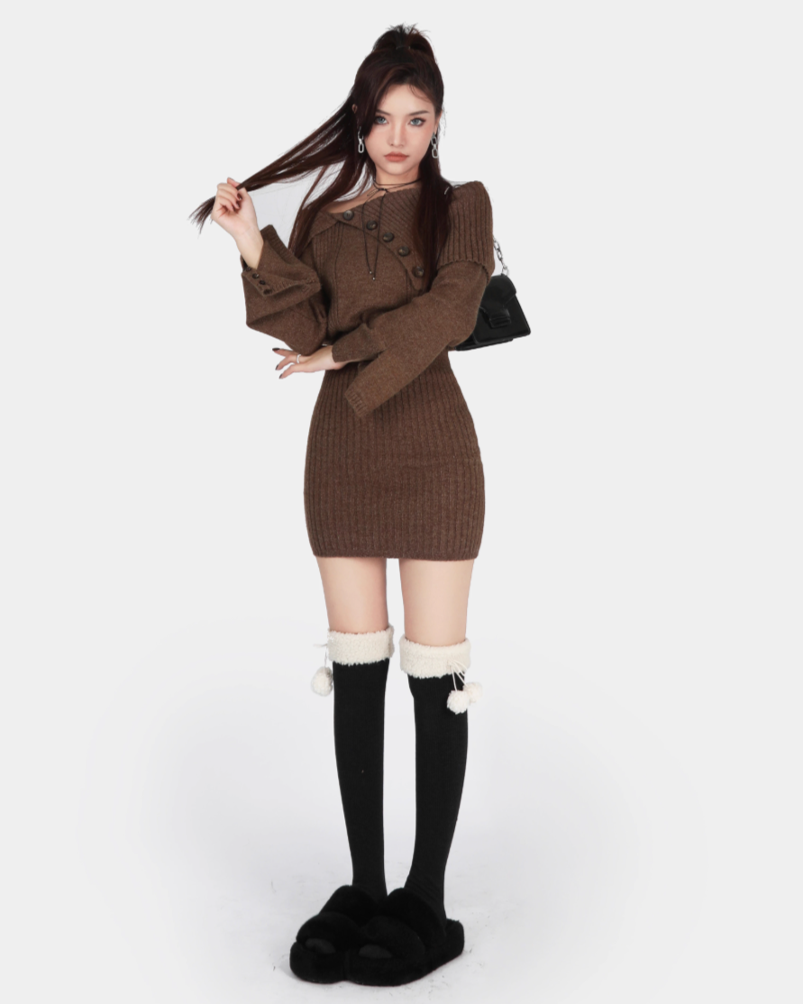 オフショルダーボタンタイトリブニットワンピース Mc 217