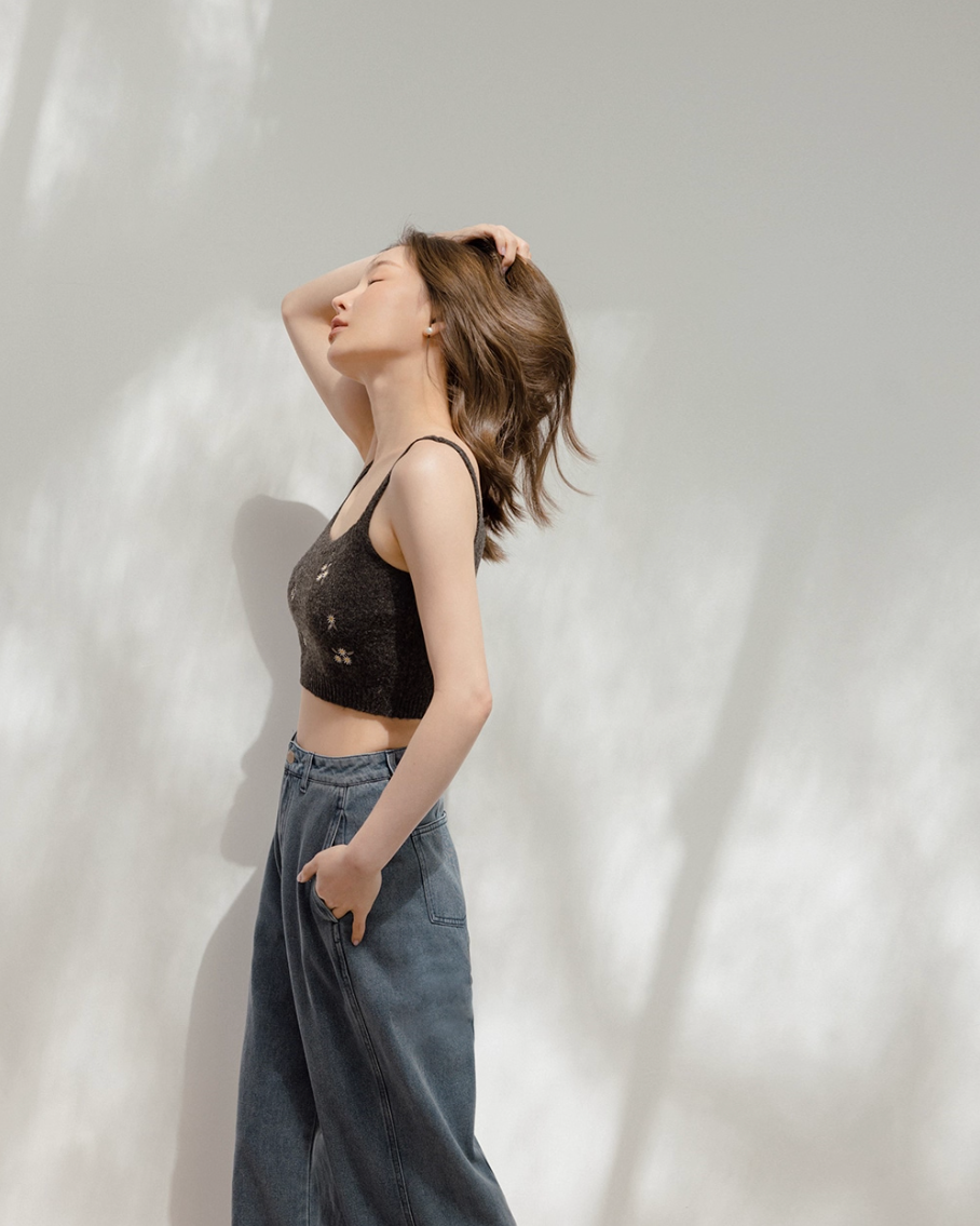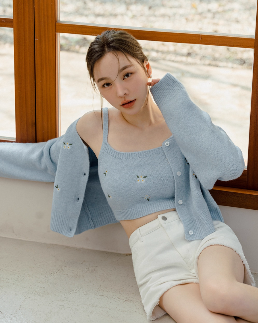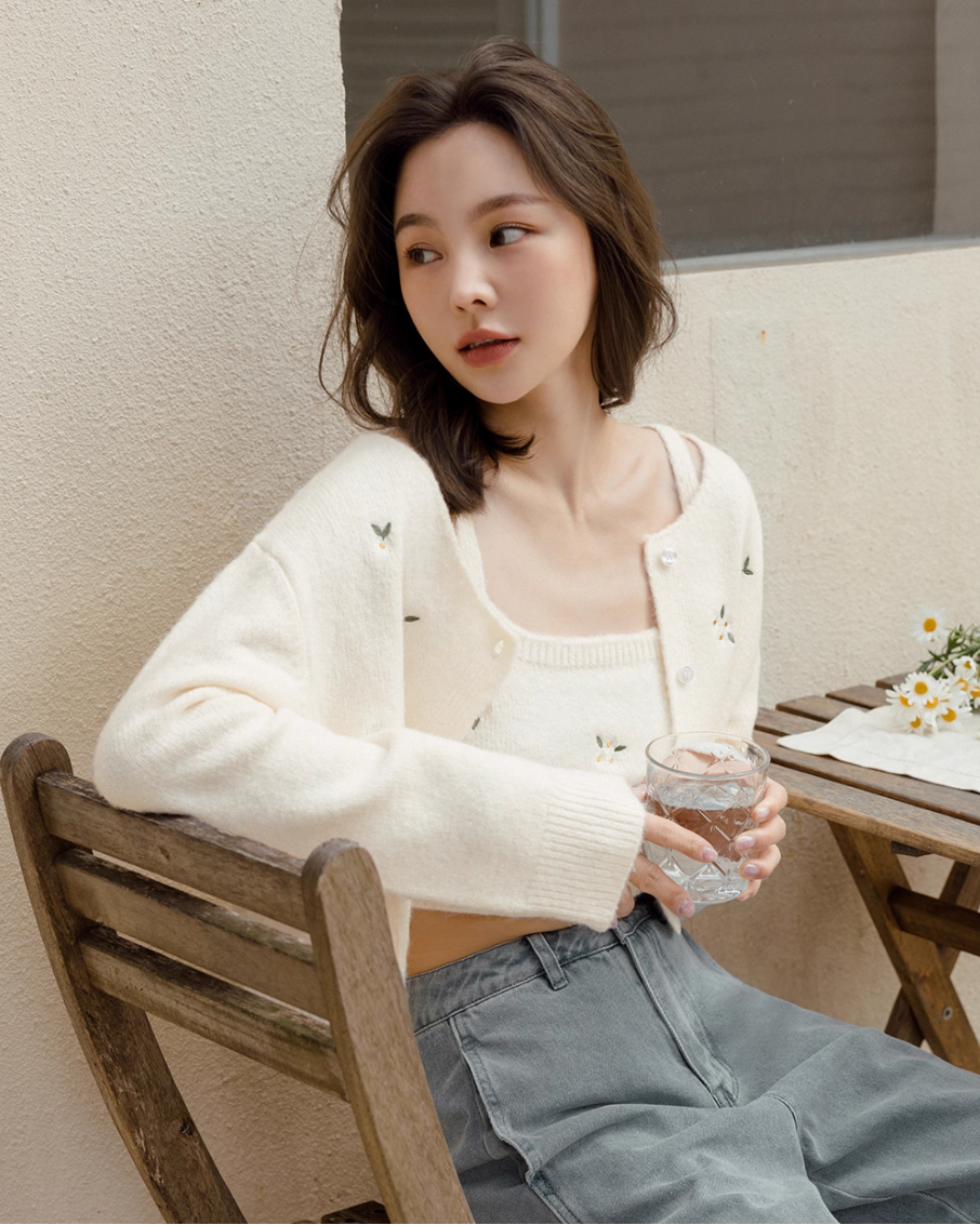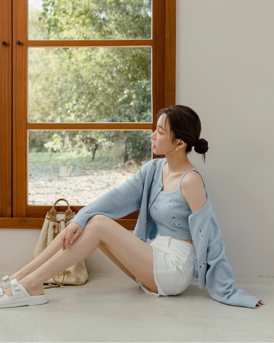 インナーとカーディガンの間から覗く肌見せが色っぽさをプラスするとともに、