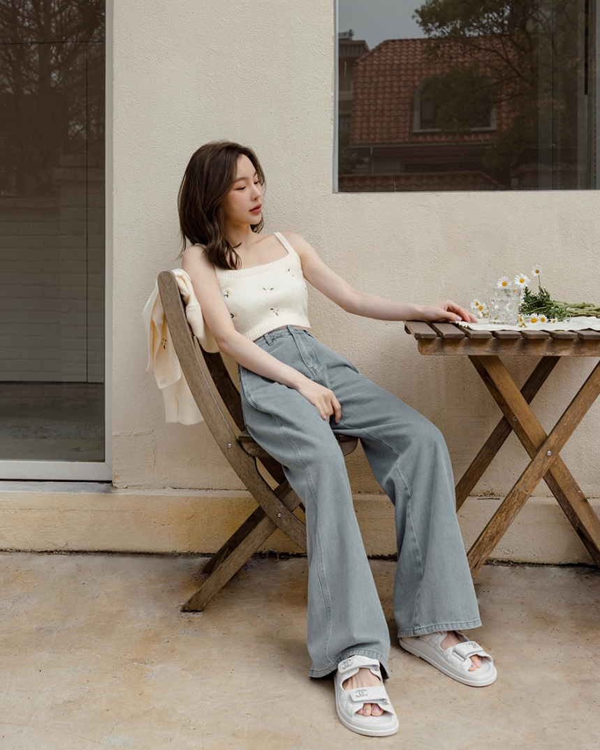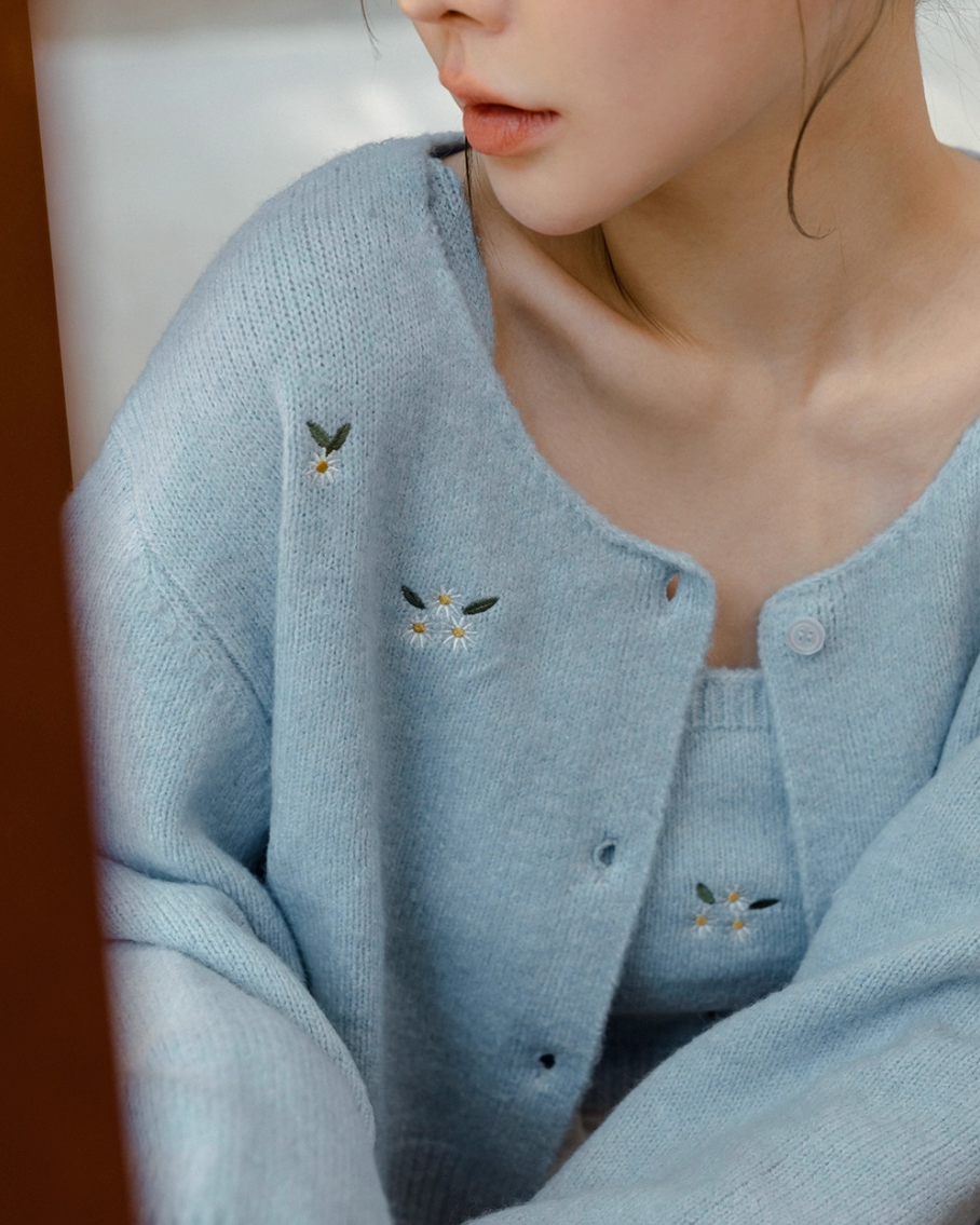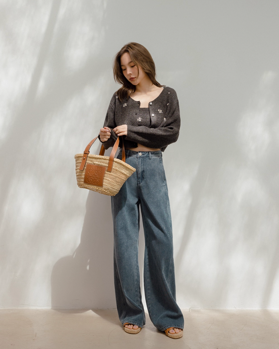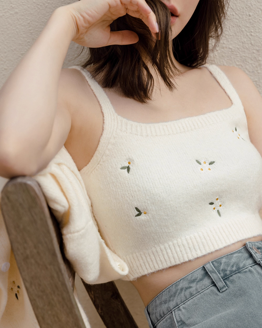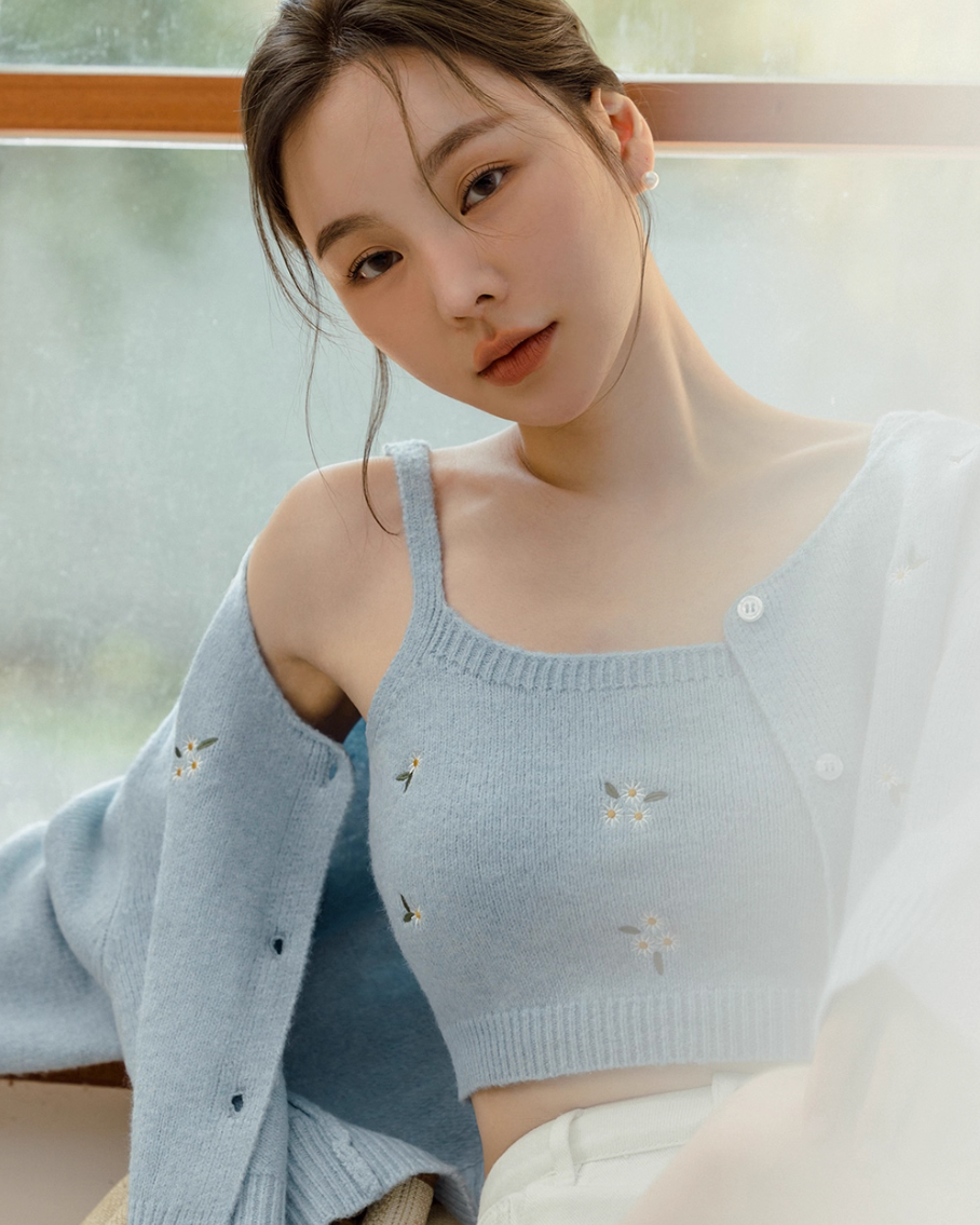 インナーとカーディガンの間から覗く肌見せが色っぽさをプラスするとともに、