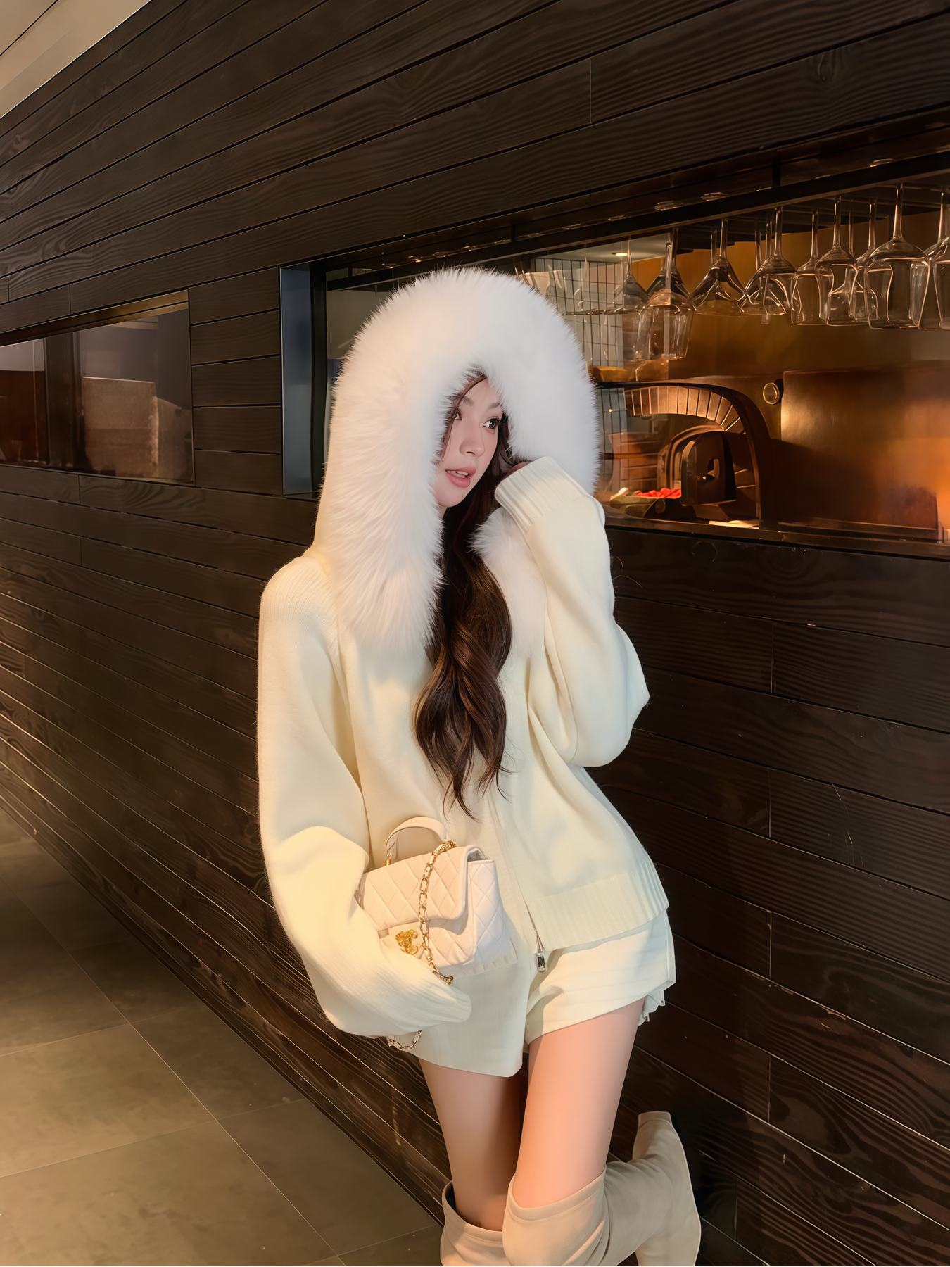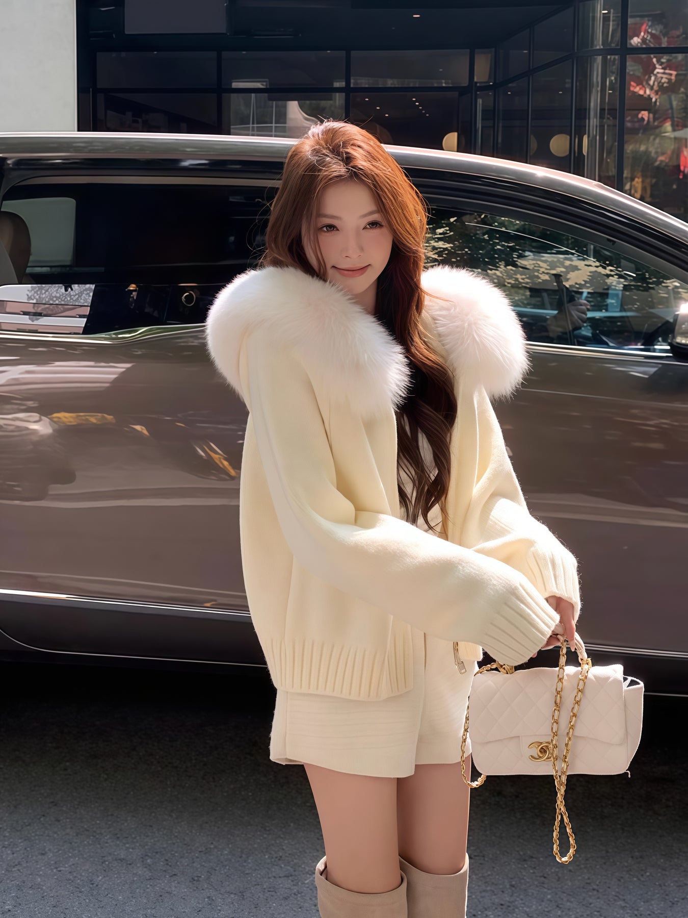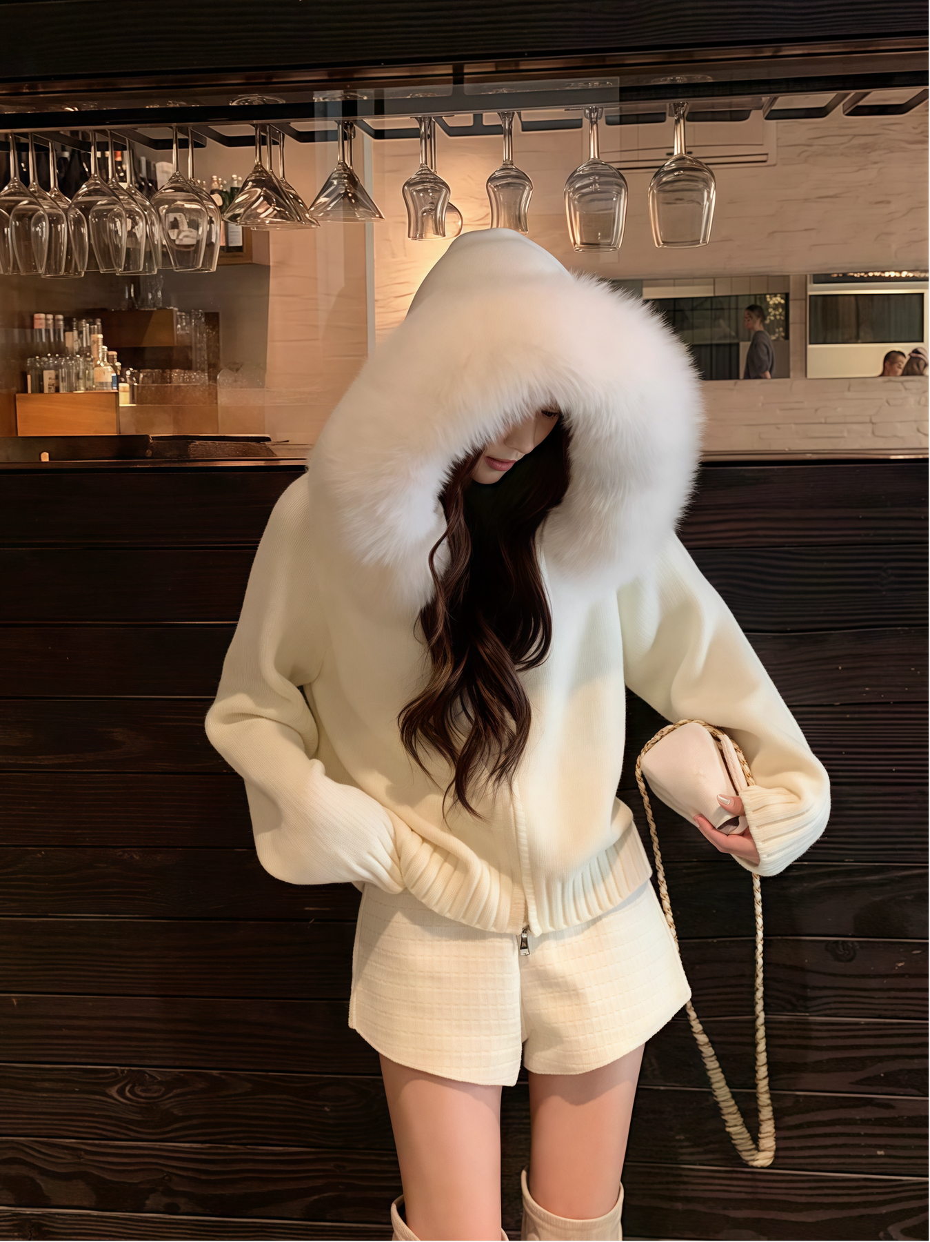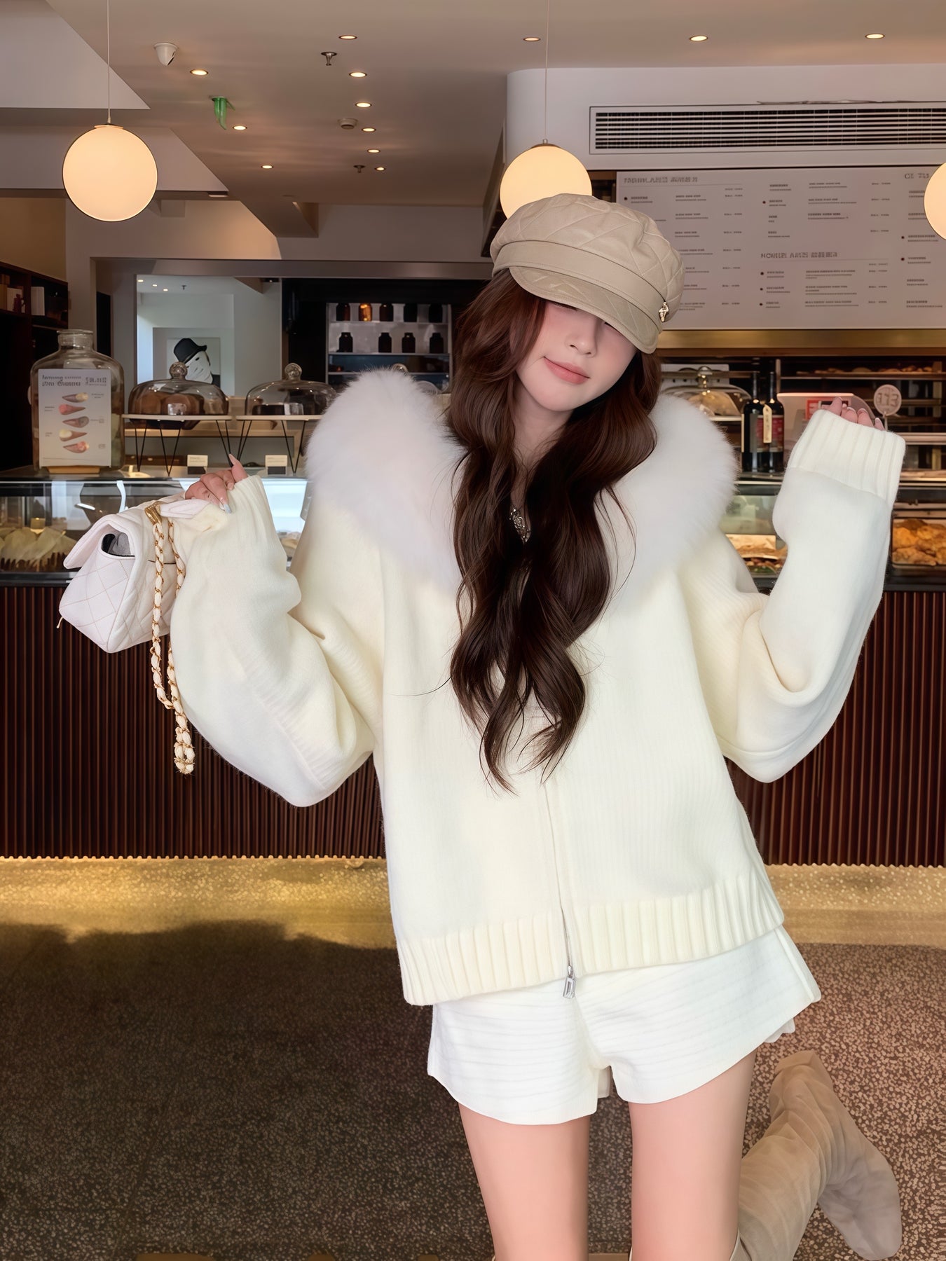 ふわふわのフェイクファーが顔まわりを華やかに魅せる、