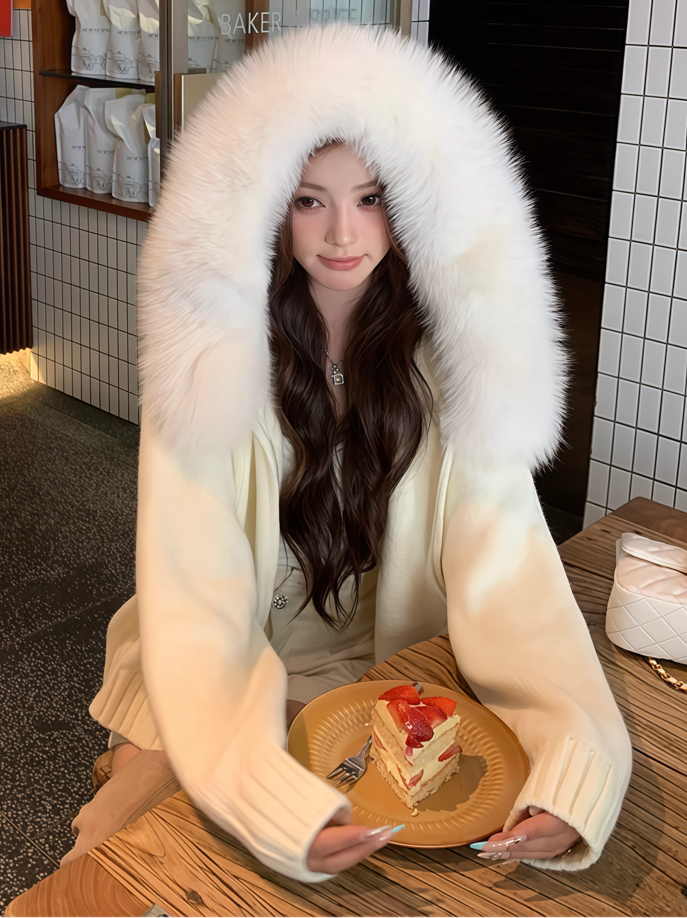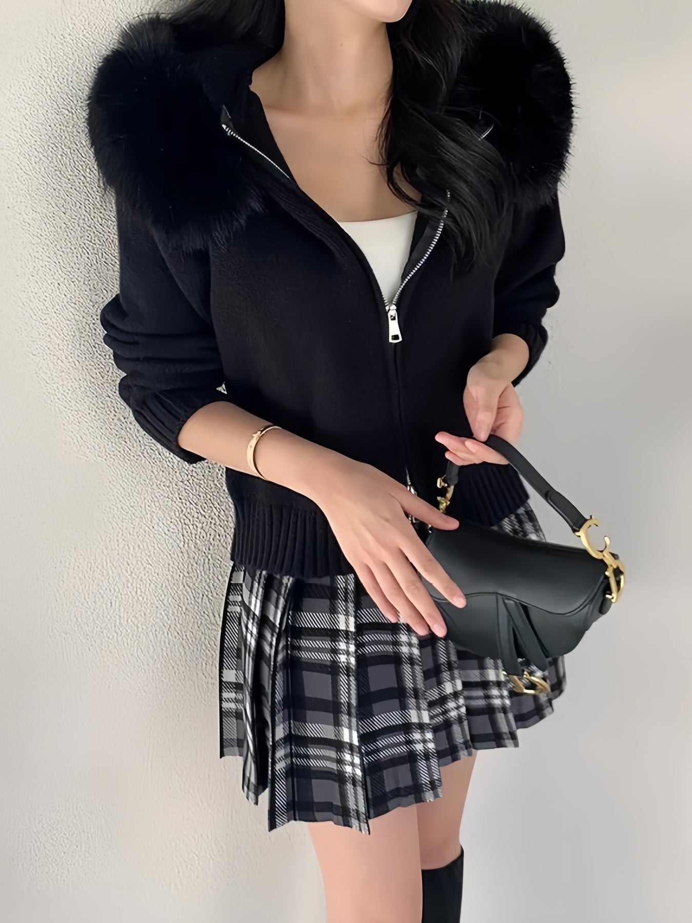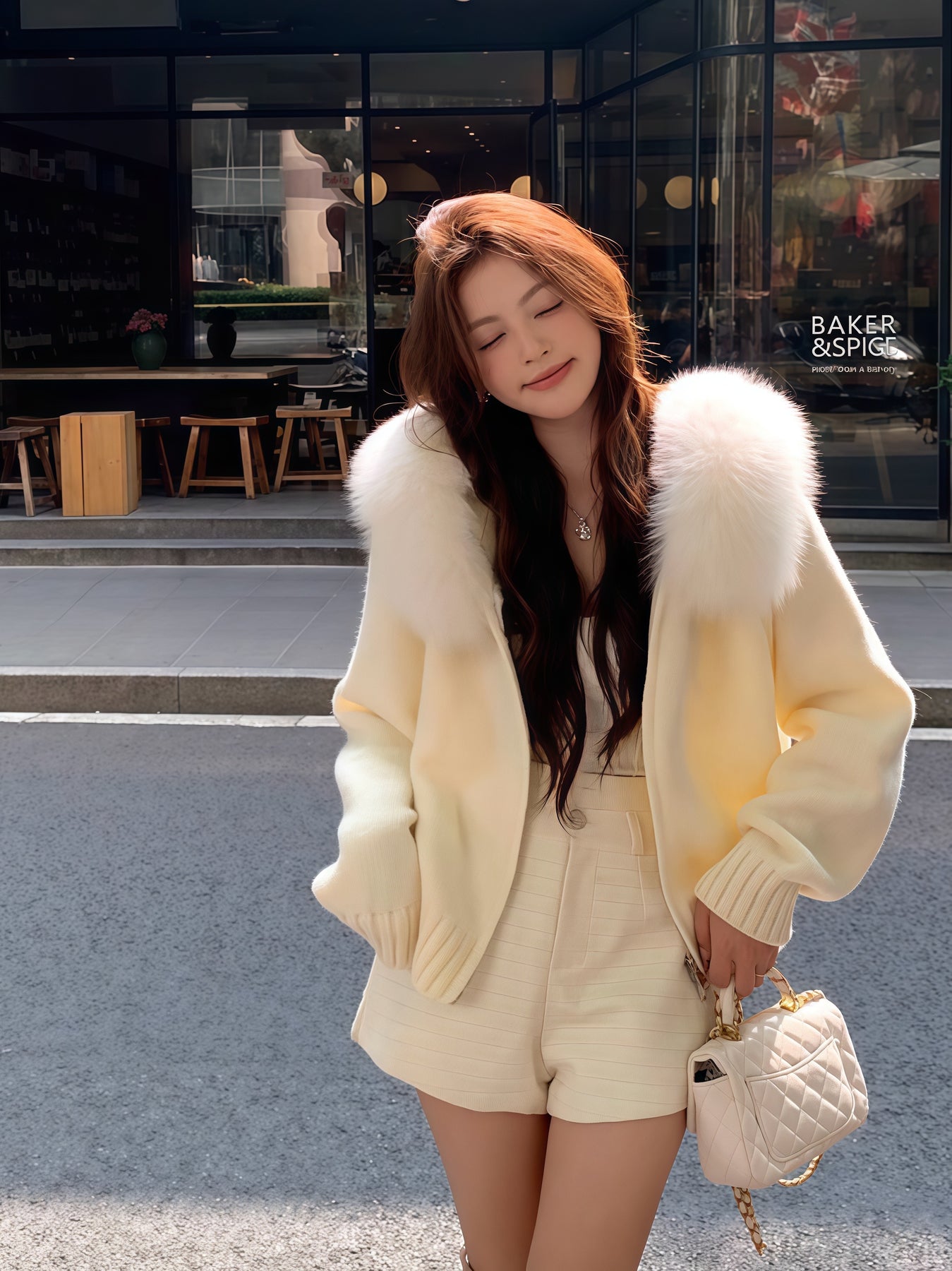ふわふわのフェイクファーが顔まわりを華やかに魅せる、