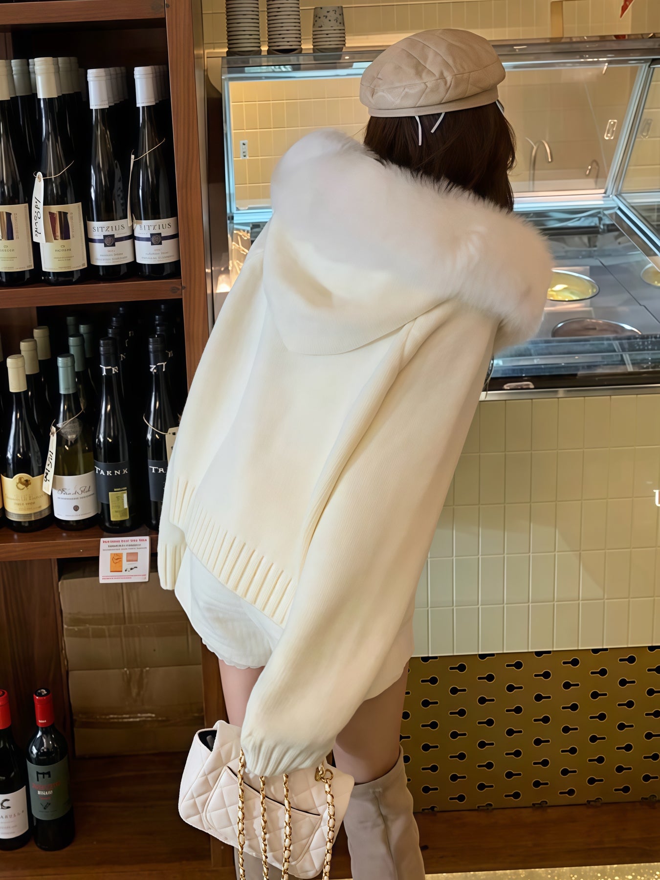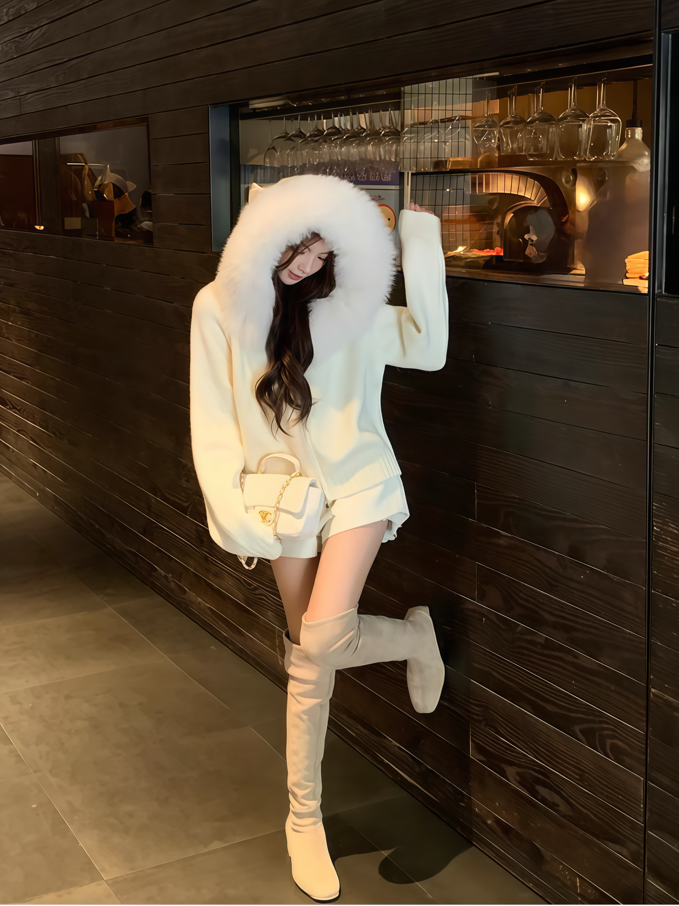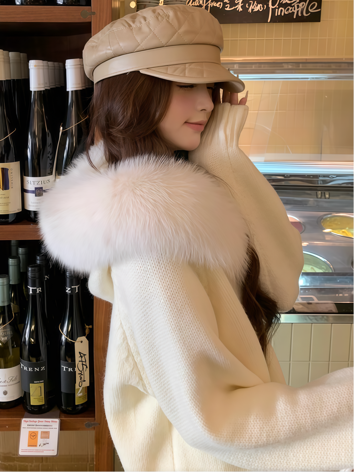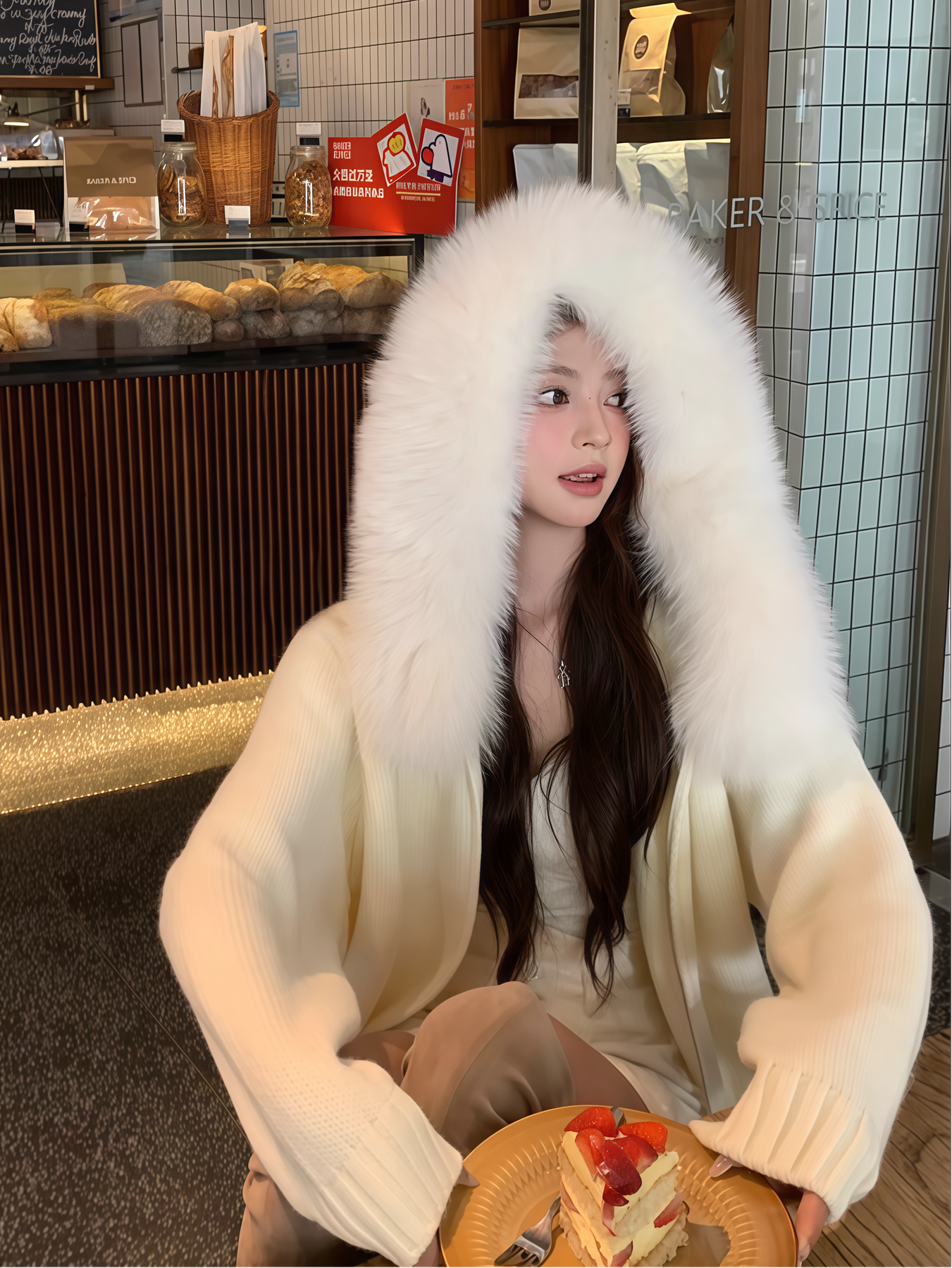 ふわふわのフェイクファーが顔まわりを華やかに魅せる、