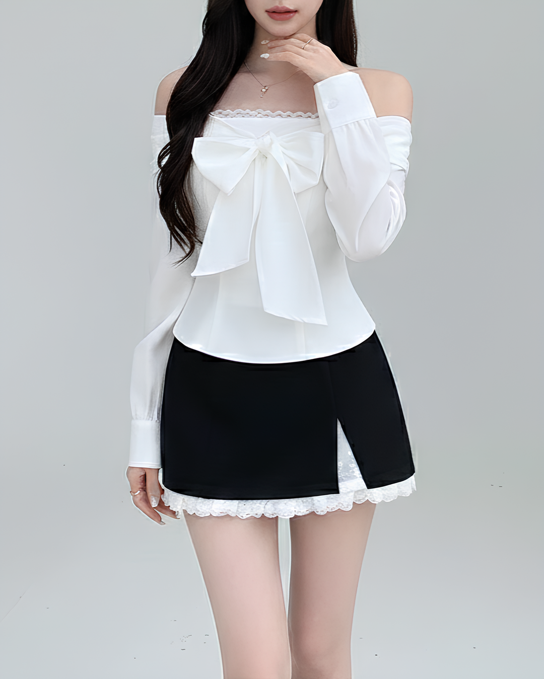 リボンオフショルブラウス×レースミニスカート Mc 733